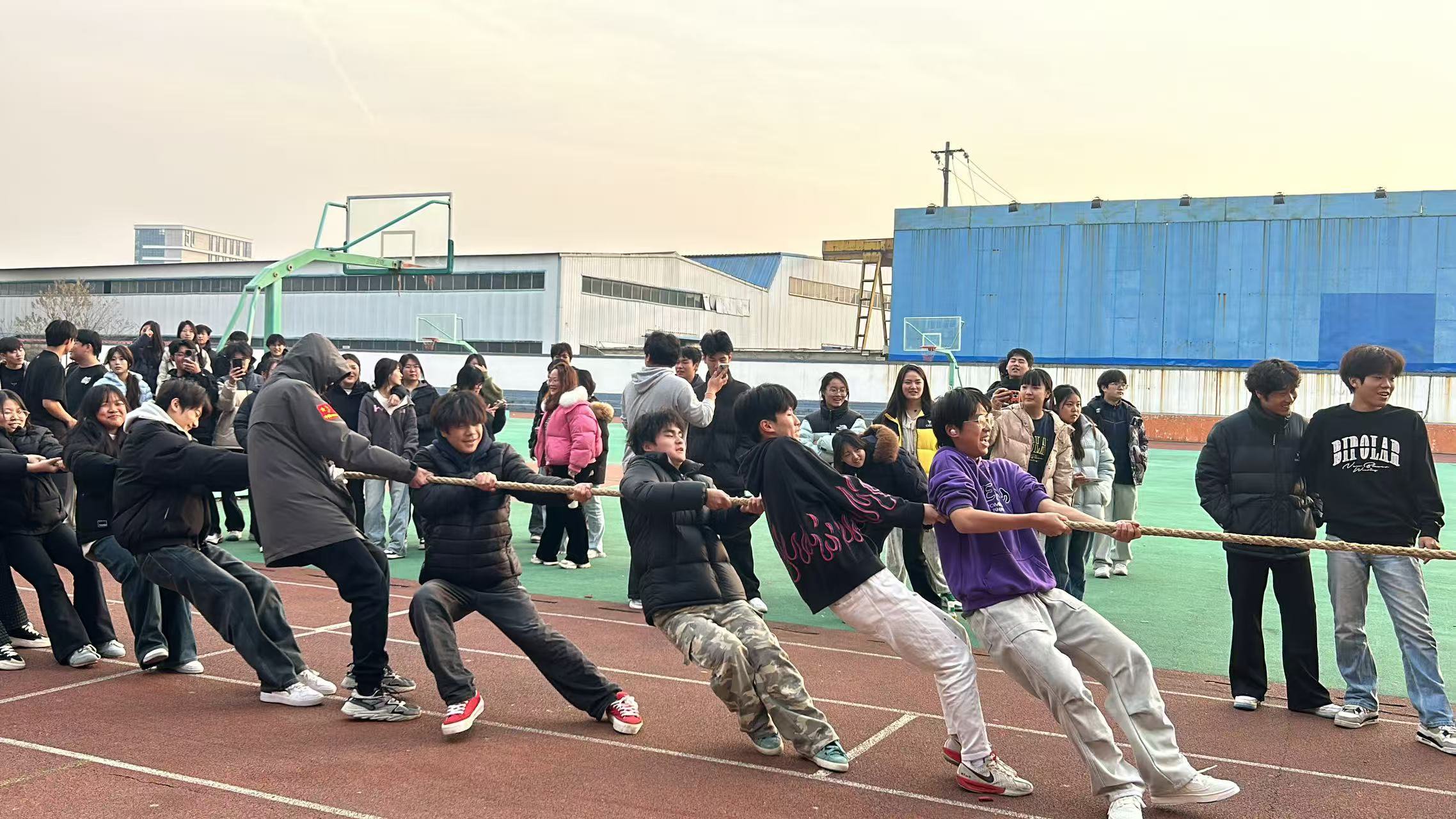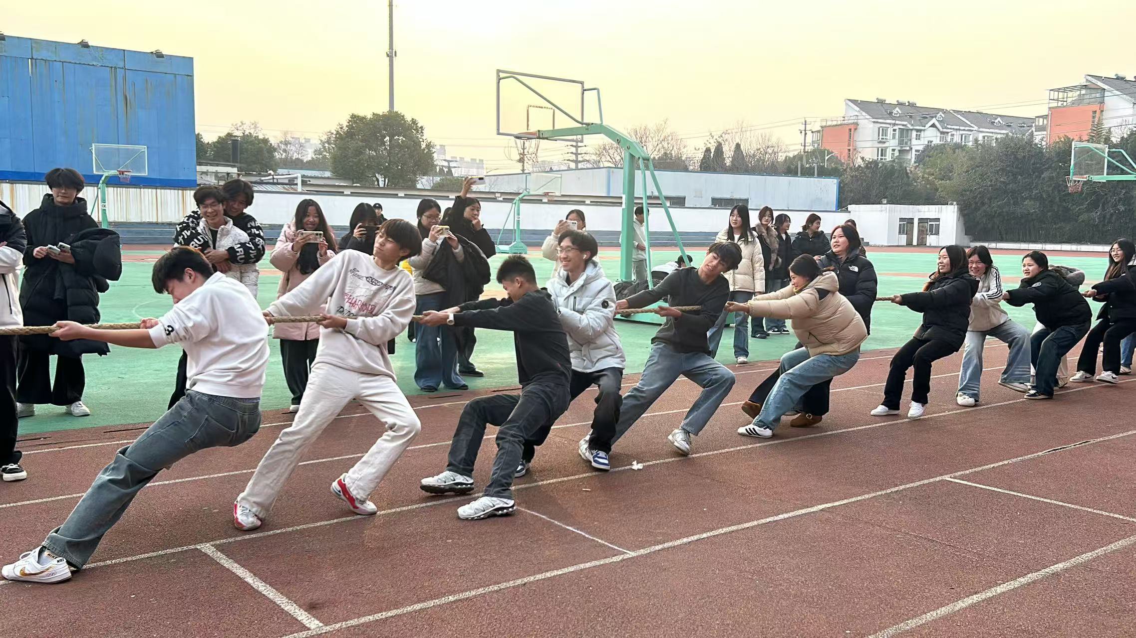 哨声划破风的瞬间,各队的气势便“焊”在了跑道上:25室内2班的队员们肩抵着肩、脚扣着脚,攥绳的指节泛白,每一次后倾都像锚定的船桅;23造价1班的选手们喉间滚着号子,有人膝盖微屈撑住重心,衣摆被风掀得猎猎作响;24室内2班的同学互相搭着臂弯,把力道揉成了一股绳;而25造价1班的少年们,刚登场就铆足了劲儿——有人鞋底在跑道上蹭出浅痕,有人被绳带得身体晃了晃,却立刻咬着牙把重心稳回去,额角的汗珠子顺着下颌线往下淌,眼里却亮得发烫。